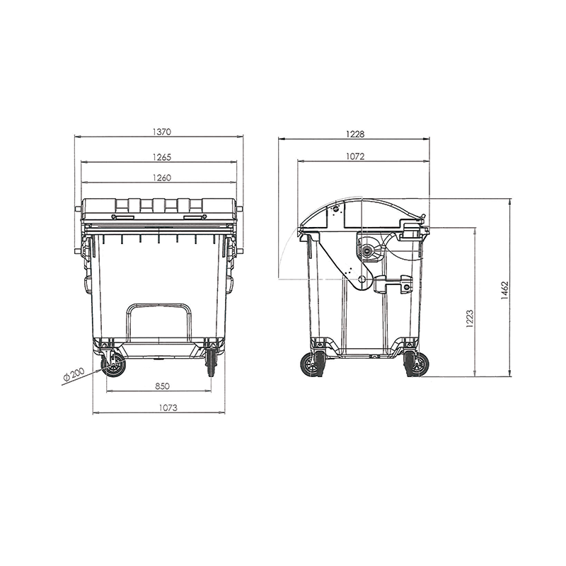 They have integrated handles in the body and lid for easy handling and are fitted with four  200mm solid rubber wheels on a 360; swivelling steel castor bracket as standard. Two of these are individually braked to prevent accidental movement.